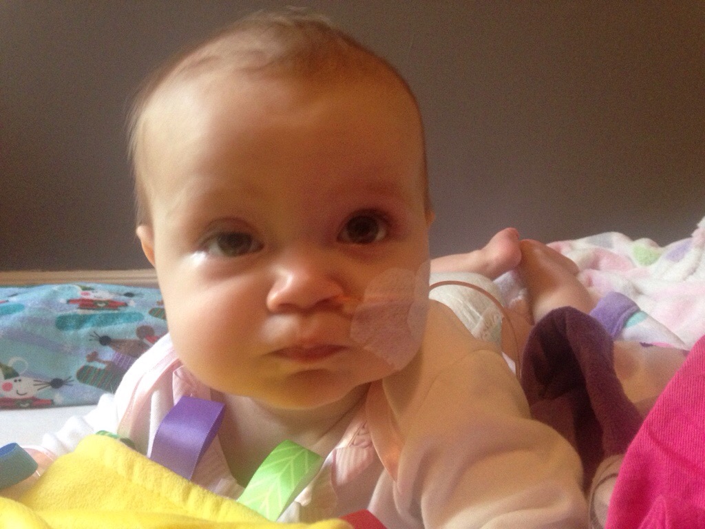 Today started out great! We had a happy baby with lots of smiles! But she got really cranky as the day went on. She threw up a little, not too much. Paul spent the night with Hana in her room. I still got up every hour to get feeds ready, give medications, etc. but I felt like I got a lot more sleep than any of the other nights. I am still really, really tired. I’m so tired I can barely put sentences together to write this. But one good thing about today was I got a glimpse at how life might be like if Hana is not so cranky and that looks like a life where I could manage things by myself again. But Hana is obviously not ready for me to handle things on my own again. I don’t know if it is teething or gas or the MMR vaccine or something else, but she really turned into a stinker pot late in the day. For the record, I love that she is a stinker pot.