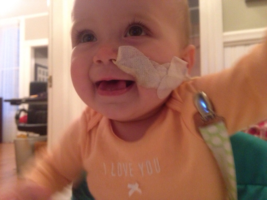 I talked to the dietician today. We are going to hold steady for now – try to not run her bolus feeds during the day while she is napping. If that doesn’t seem to help over the next several days then we may try having her nap and sleep on an incline. We will do another weight check in ten days or so and see if she is gaining. They would like her to gain a little bit more than she has been. Oh, did I mention that she gained weight at her weight check yesterday? She gained 100 grams over the last week, which I think is about 3.5 ounces.