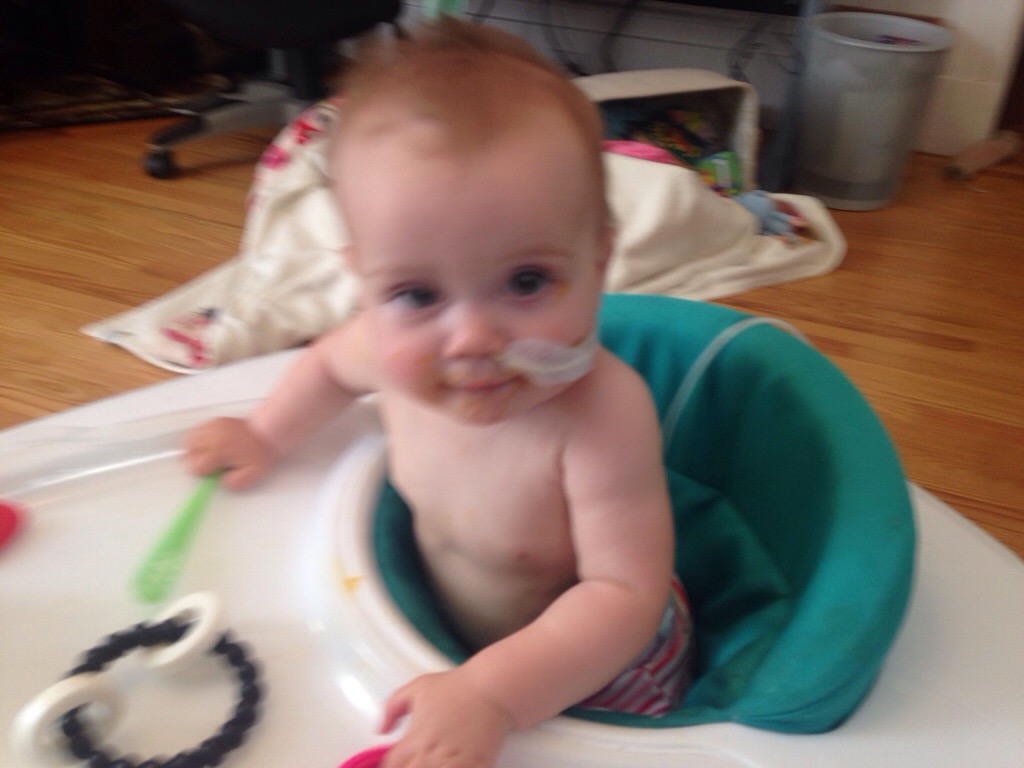 Anyway, I haven’t had time to write. Hana saw the feeding specialist again yesterday and we had a fairly successful session where Hana ate a couple of teaspoons of prunes. A few hours later, back at home, she vomited a lot. It was at the end of her feed and it looked like the entire feed. It didn’t even look slightly digested, it just looked like milk that had spilled on her tray. She vomited a second time yesterday, but now I can’t remember when. It was a very small amount, whenever it was.