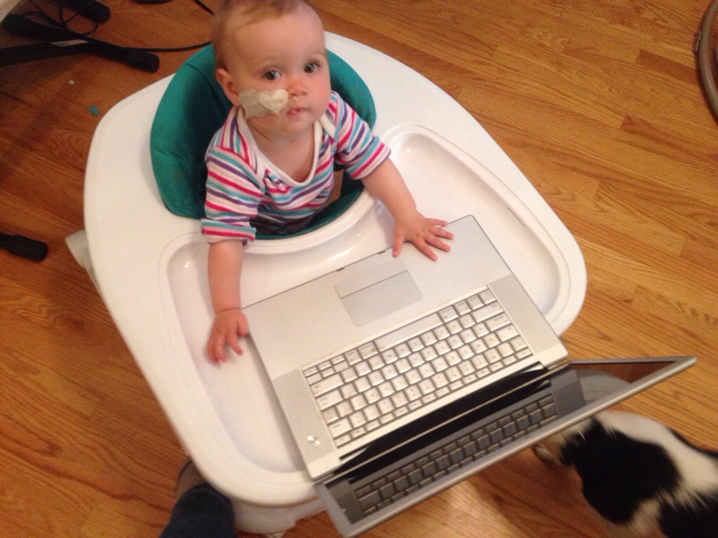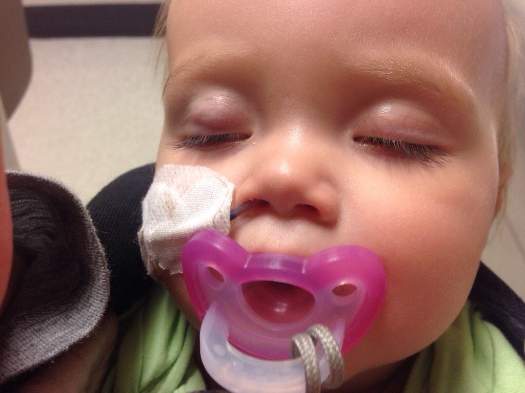 This is how we hook up Hana’s feeding pump (in the hanging black backpack) and keep her upright while it is running.