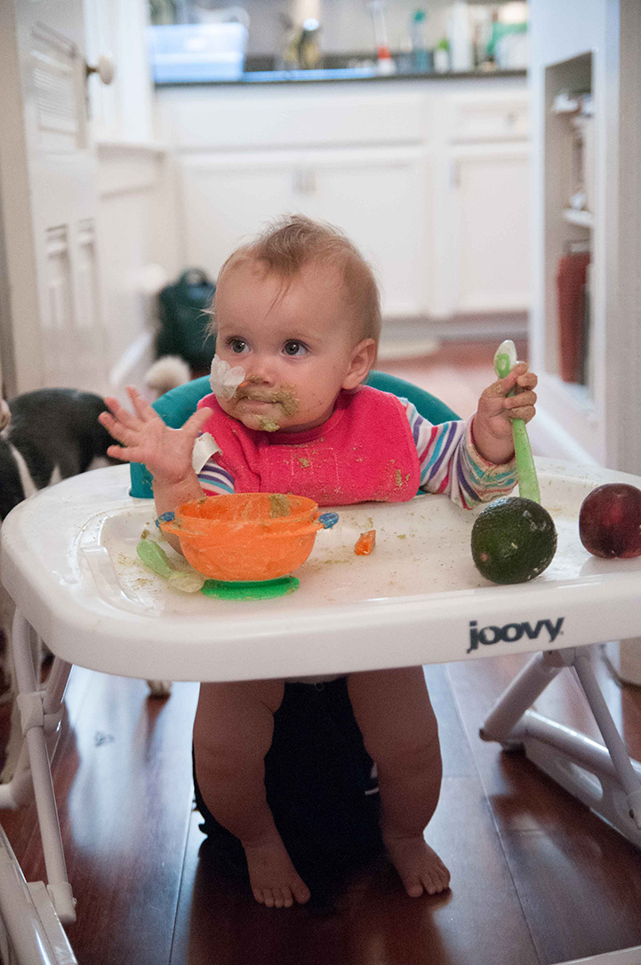 We’ve discovered that Hana really doesn’t care for anything sweet. That leaves all prepared baby foods pretty much off the table (literally). I made some whipped potatoes and whipped broccoli. I whipped them with greek yogurt – which is Hana’s favorite food. I also whipped up a very small avocado. We alternated between these foods, mostly choosing potatoes and yogurt. Hana will actually grab the spoon of yogurt and put it in her mouth herself, which is really amazing. The others she’s not so crazy about. The more yogurt it has in it the more she likes it.