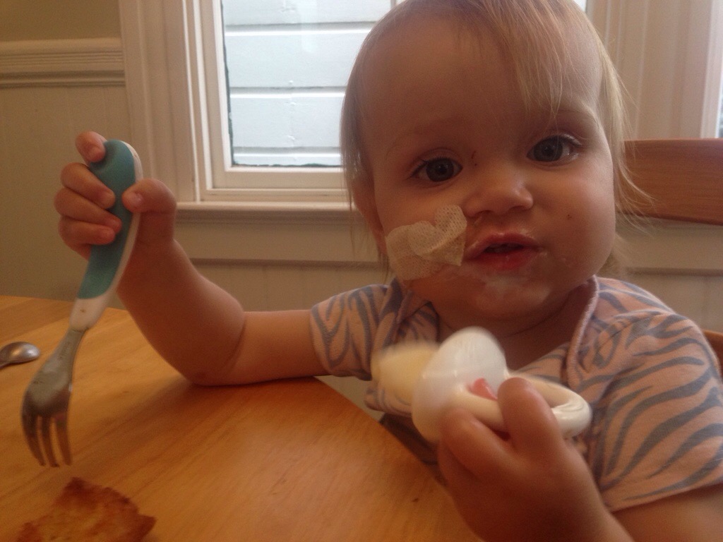 It appears that the honeymoon of eating and drinking is over for now. At least Hana seems to be settling into a new habit of exploring new foods and textures. She is not quite as enthusiastic about food as she was last week, but it is much, much better than she has been over the last several months. As for drinking, we have not achieved a 400mL + days since Sunday, the day my mom left. Today was as little as 160 mL, but yesterday it was 300 mL. Overall, it is down way too much to even think about doing a wean from her NG tube. Not to mention the fact that her weight is still down.