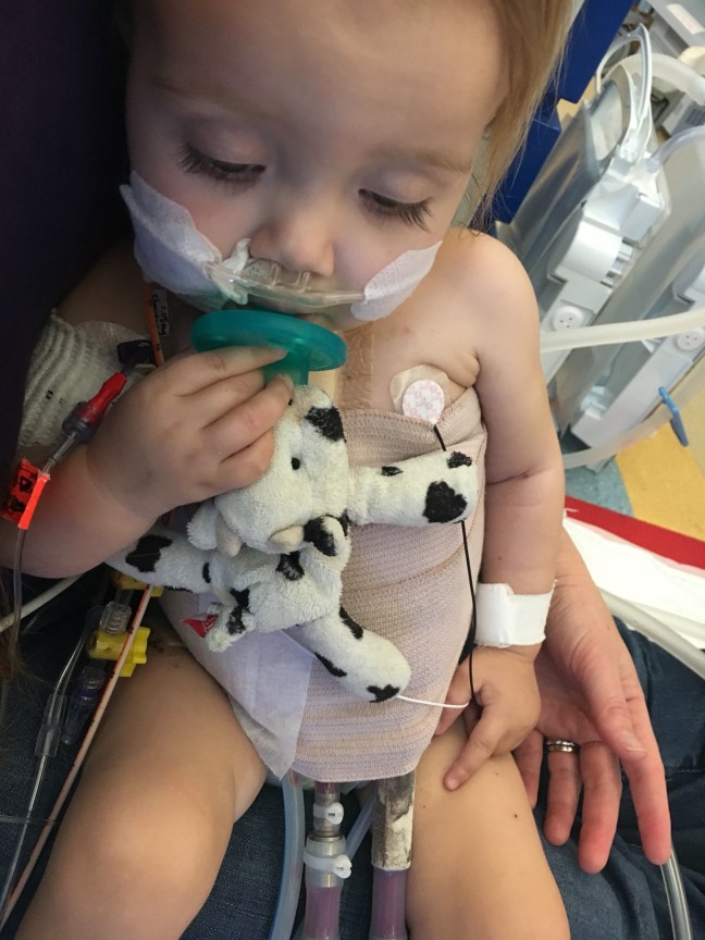 Today they are continuing to wean Hana’s Precedex (dexmedetomidine) drip. Her clonidine patch should be effective so they can start to wean a little faster. Overall she is a little overly sedated. We are trying to be careful that Hana doesn’t get her days and nights mixed up! Last night she was wide awake and playful at 10pm. They are also increasing her aspirin to 3 baby aspirin a day (crushed, mixed with water and sent down her feeding tube). Since they took out her arterial line yesterday, Hana must have blood drawn peripherally- the way we all do, with a needle stick. This will still happen every day for a while until her results are stable and then she will only do it it twice a week.