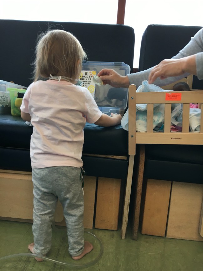 We have been trying to change up the room, get out of the room, invent and do new things. It has been challenging! Hana’s new park is the small atrium in the middle of the hospital. Her new playground is the trains. I hope she doesn’t get too bored of them too quickly. I contemplated purchasing a little slide with steps that folds up but I don’t know where we would put it! It is hard enough to move around in this room as it is!