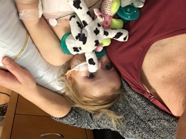 I’m going to keep this short because I’m so tired! Hana is doing really well, despite the fussiness. She has a lot of teeth coming in right now, luckily the molar is mostly poked through the guns, but the rest are coming in slow. Hana is off of Ativan and still weaning methadone. No preschool tomorrow because she will be hooked up to her IVIG treatment. They are running it slower this time. Also she can’t stand this time (I should say not allowed) because her IV is in her foot!