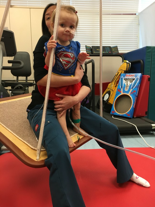 This week has been about going to PT/OT, preschool, going on walks, and trying to get on a sleep schedule. Hana is now on her goal calories of 30kcal/oz for her feeds. She is still getting continuous feeds which is very inconvenient to carry the feeding pump around (another tether!). I am going to push for trying bolus feeds again next week. She has started drinking again – about 4 ounces a day! She is also interested in food and has been doing a lot of food exploration! Hana is still weaning off her methadone and Ativan. Most of her other meds are pretty much at her goal dose although there will be some tweaking as we go on her anti-coagulation meds.