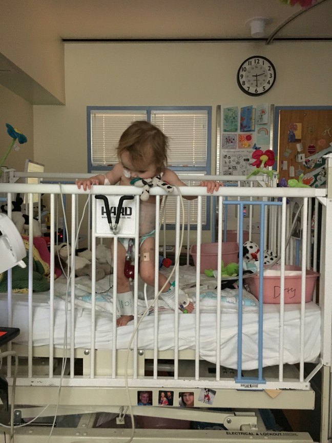 Hana has not been as happy this week. I’m hoping it is just teething and not that she is bored or an upset stomach so much of the time. She does seem to be sleeping a bit better, overall. Last night she did throw up in the middle of the night, so I don’t know what that is about. Blood work and the dressing change went fairly well this week but Hana complains a lot more than she used to. She is also afraid of every person that walks in the room unless she knows them and they are not here to poke or prod her. It makes me a bit sad to see this but I hope we can teach her to trust people again.