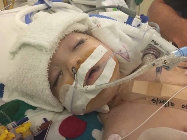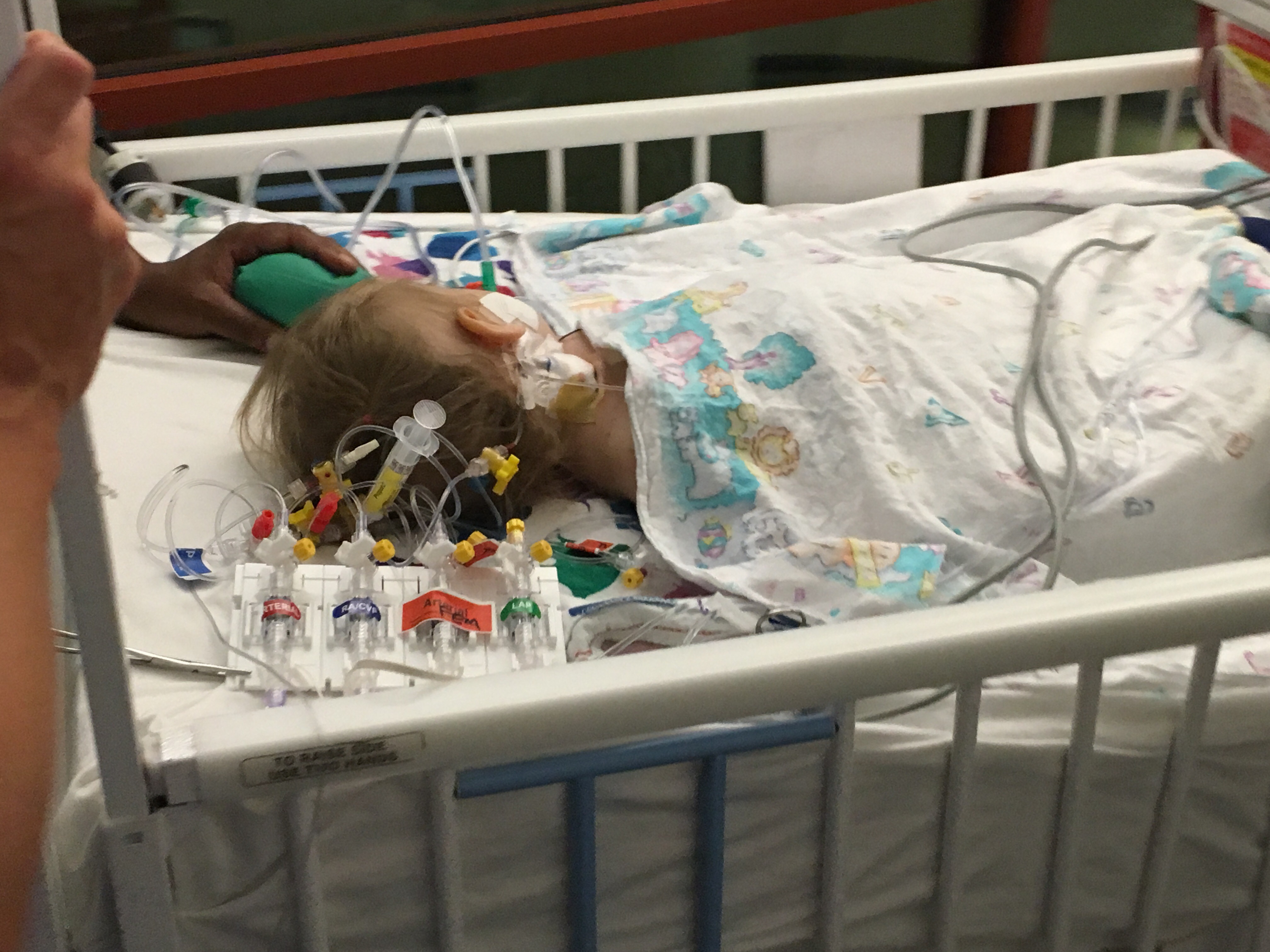 In addition to her breathing tube, she has two arterial lines, a 3 IVs, an IJ (internal jugular central line), 4 chest tubes, a Foley catheter, pacing wires and of course her incision in her chest and the two areas where her Berlin Heart cannulas entered her body.