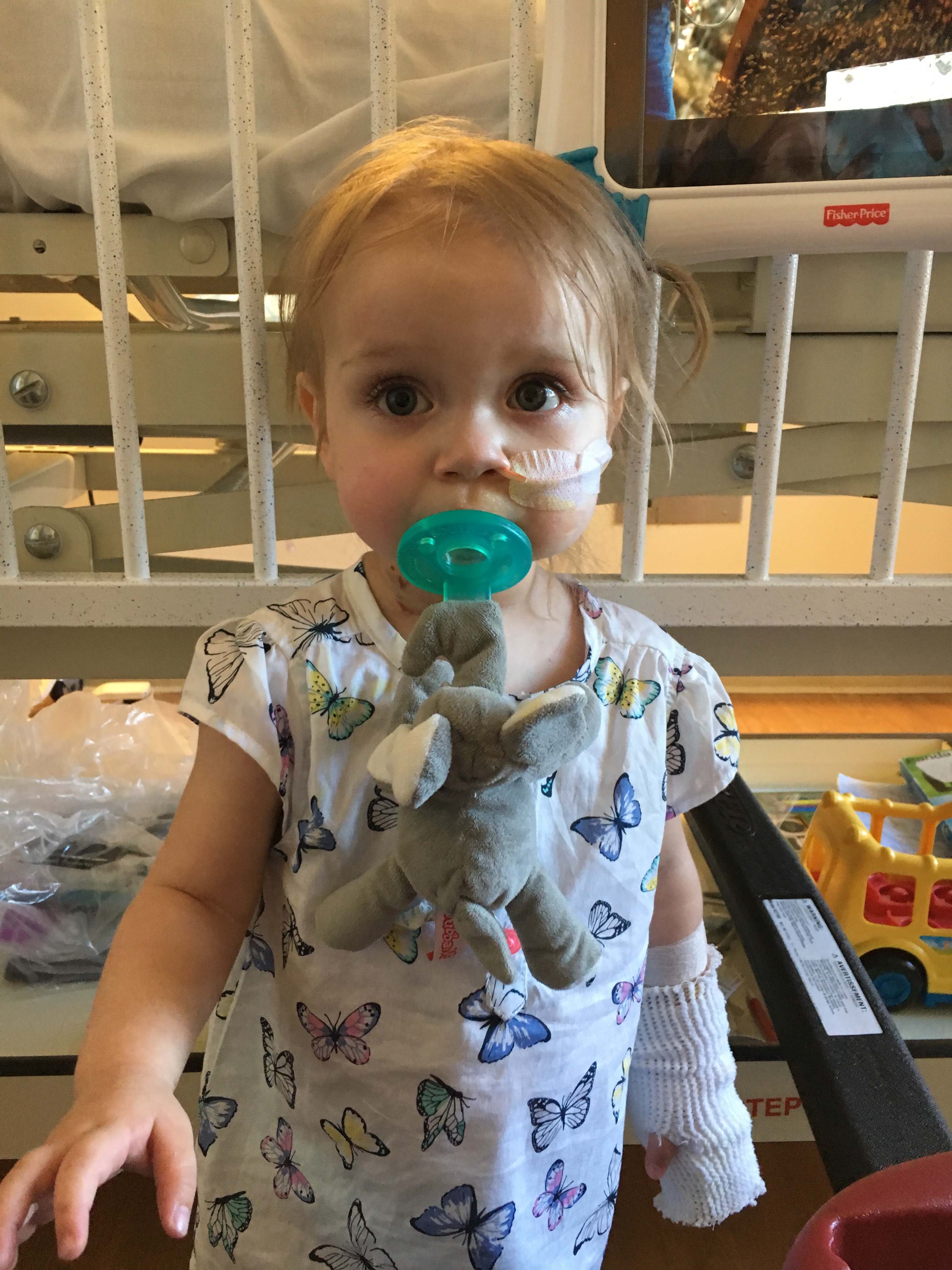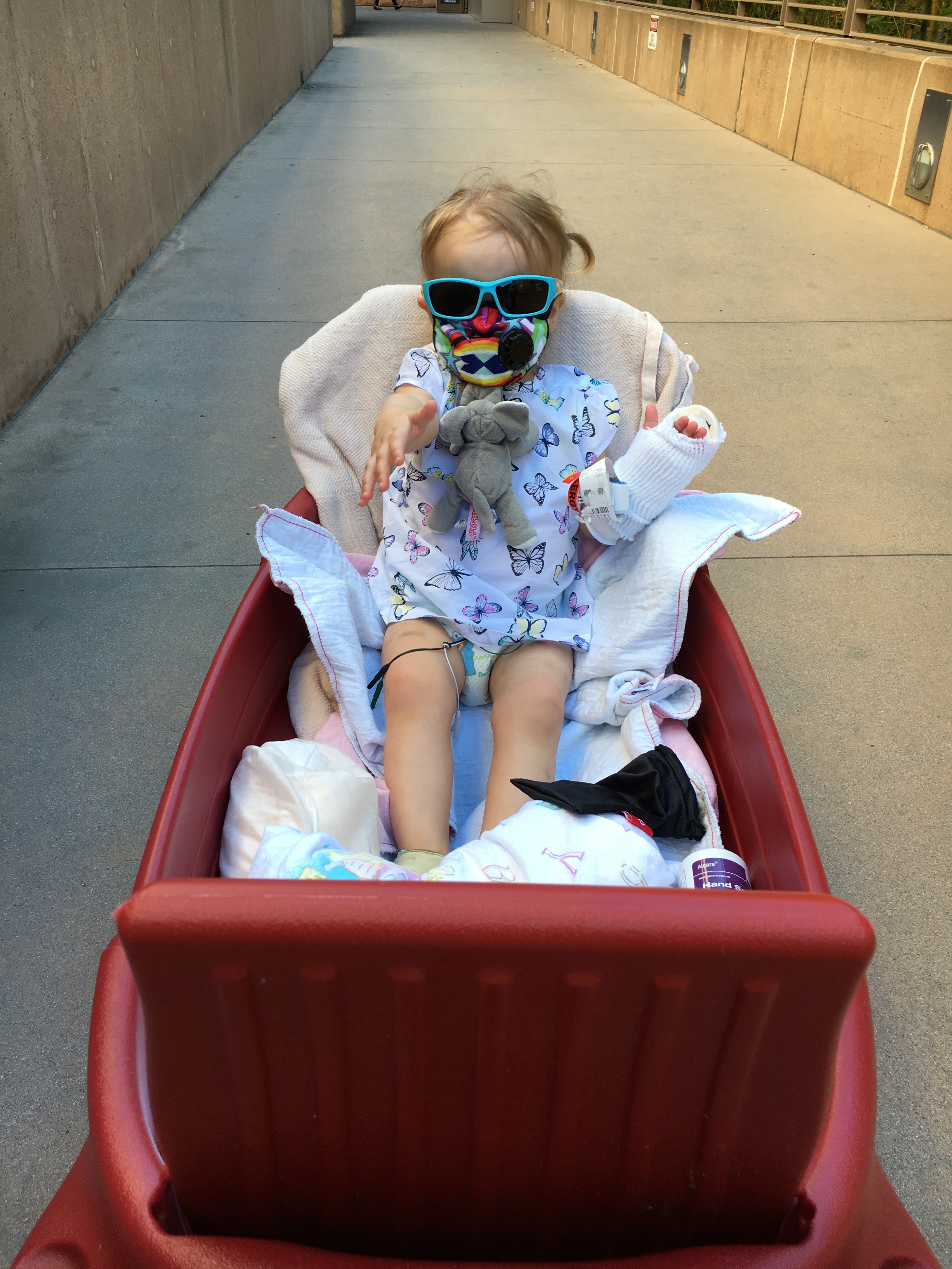 Hana did a LOT of walking today. She got the okay to be off the portable monitor so now we can pretty much take her wherever we want in the hospital, including out front and the atrium. We spent a lot of time outside. Hana was content to sit back and let me pull her in the wagon through all these places she’s never been (or at least not for a long time, before being admitted). But then she wanted to walk and roam. We need to get her some sun protective clothing because she will be VERY sensitive to sunlight.