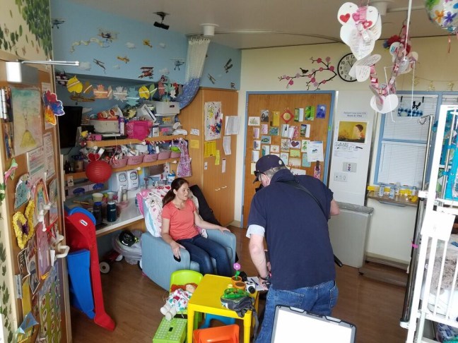 Of course, you can’t cuddle all day, every day. It seems like that would be the best medicine, but sometimes getting up and moving around is also very important. That’s when you have to push tough love because Hana did not want to get up. It was time today for her to really start moving. They turned off her oxygen this morning and Hana needs to work her lungs. A friend (adult) that Hana loves came to visit and that was motivation for her to start playing and talking a little and she even ate a little food!