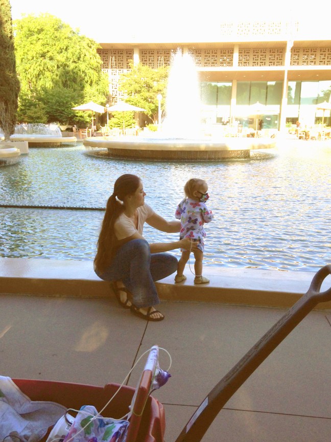 In the evening Hana’s nurse, one that she’s had in the past, took us over to the adult side of the hospital to the big fountain. We wheeled her in her red wagon through the empty, Sunday halls to the main entrance. It was her first time outside without the Berlin Heart since mid-November. When we got to the fountain, a place Hana has never seen before, she tried to climb out of the wagon. We helped her out of the wagon and I thought she was going to jump in the pool of water! (She can’t take a bath for at least six more weeks.) Hana has barely stood, let alone walked, in a week but she started walking and almost running around the perimeter of that fountain. She started signing too – water, tree, again, bird, rain – she thought the fountain was rain. She was in awe. She was just amazed and joyous. Her transformation was so amazing, I think we were all teary eyed.